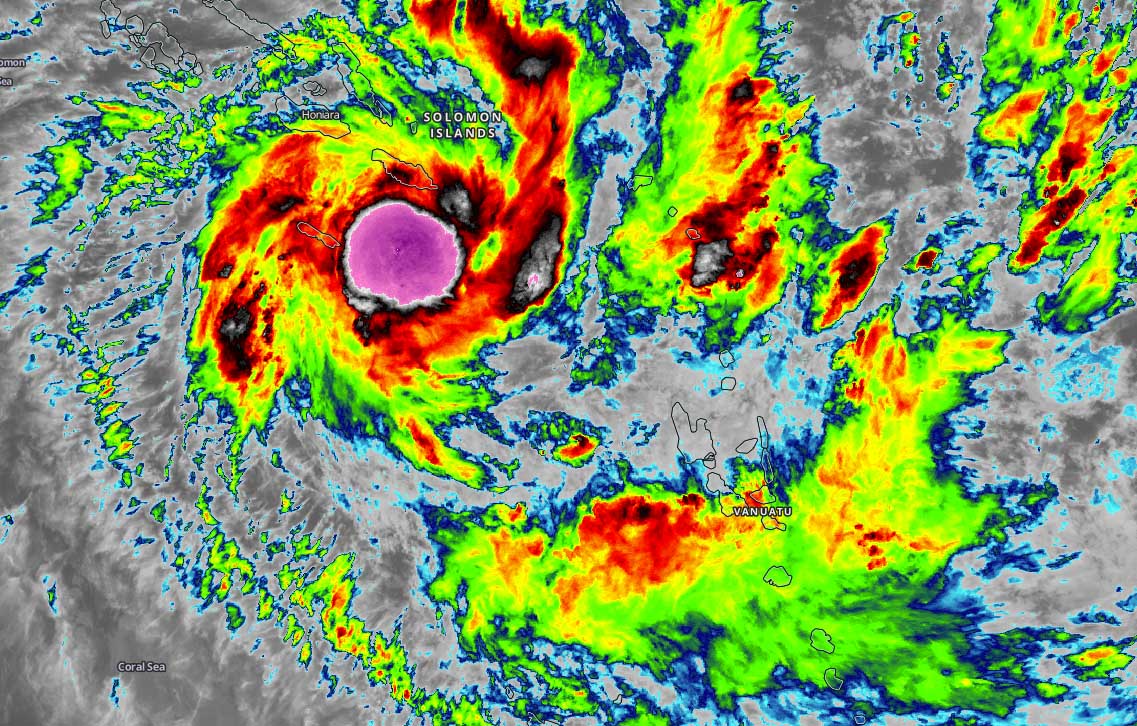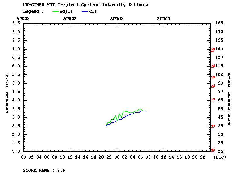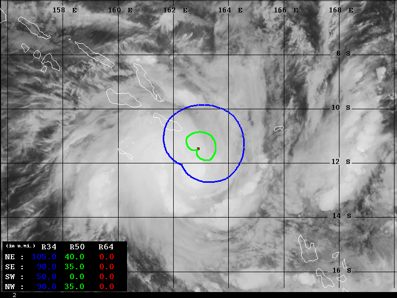 Advanced Dvorak Technique (ADT) analysis indicated Harold has been steadily organizing over the past 24 hours. The system already has 50-knot wind radii, extending 35-40 miles around the center. 34-know winds are affecting the southeasternmost island San Cristobal of Salomon islands: