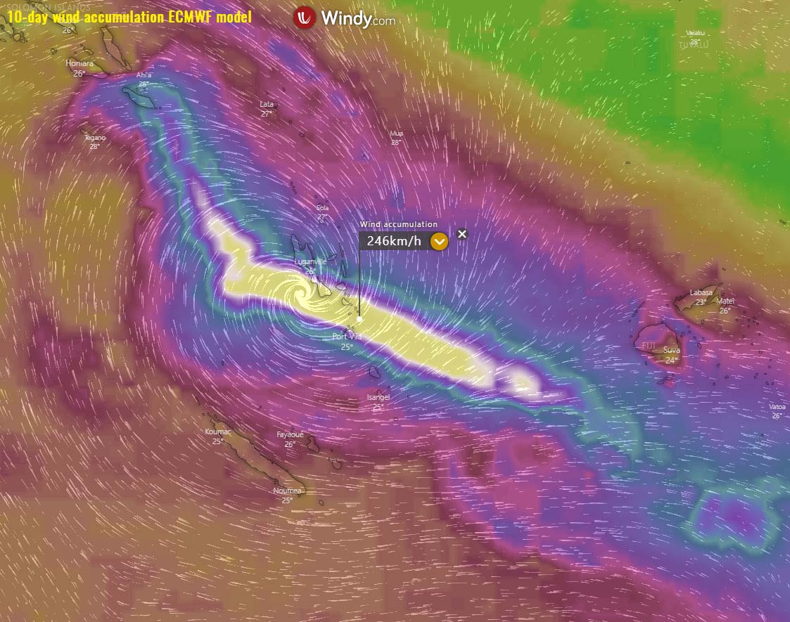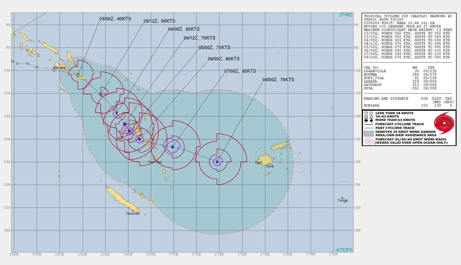 The future track will bring Harold towards Vanuatu archipelago while gradually intensifying this weekend into early next week. The system could potentially become a Severe Tropical Cyclone with 85-90 knots of maximum sustained winds with destructive winds and flooding over Vanuatu. Further movement will push the system towards the southeast and could eventually turn towards Fiji.