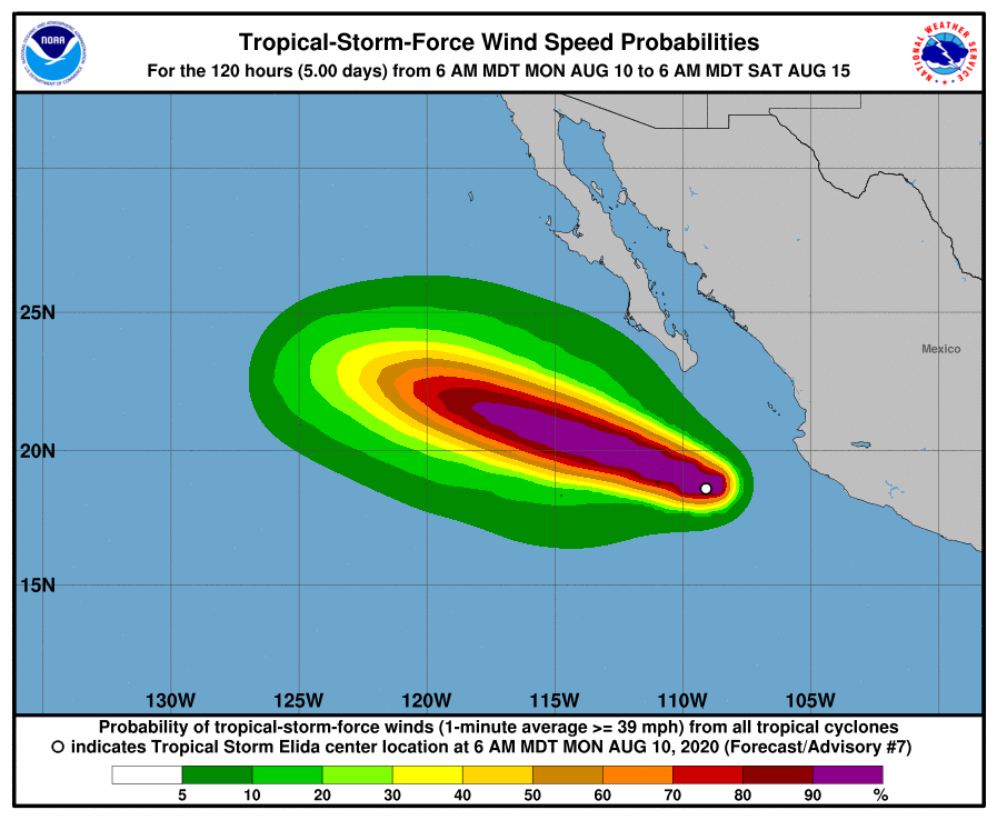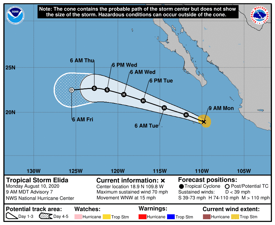 The National Hurricane Center (NHC) is forecasting that Elida will become a hurricane tonight. Maintaining its strength over the next two days. The forecast tracks it towards the west-northwest, to the southwest of the Baja peninsula. It will stay away from any land.
