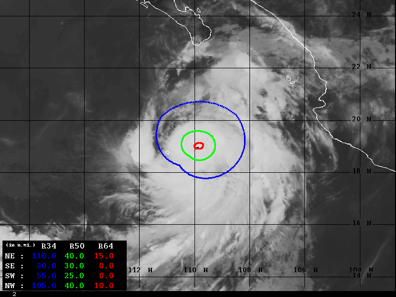 Advanced Dvorak Technique (ADT) analysis estimates indicate that Elida already has 25-40 miles of 50-knot wind radii. And it also has 15 miles wind radii of hurricane-force winds across NW and NE quadrants. Further strengthening and expanding of the wind field is expected.