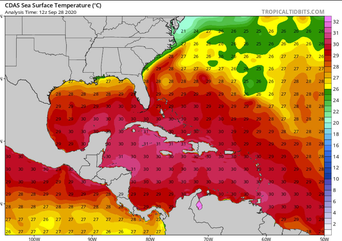 Normally, the western Atlantic and especially the Caribbean has a very hot water through September and October months. Temperatures are no different this year. 30 °C to nearly 32 °C are spread across the whole Caribbean region, especially around Cuba and Jamaica.
