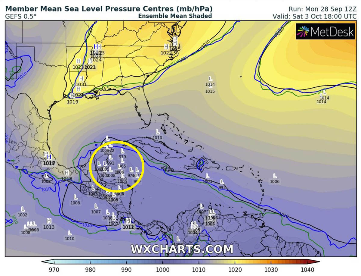 The NHC is forecasting there is a 40 percent (%) chance of a tropical depression formation over the next 5 days. The ensemble forecast (attached is the GEFS model) does hint a fairly reasonable potential over the northwestern Caribbean for this weekend.