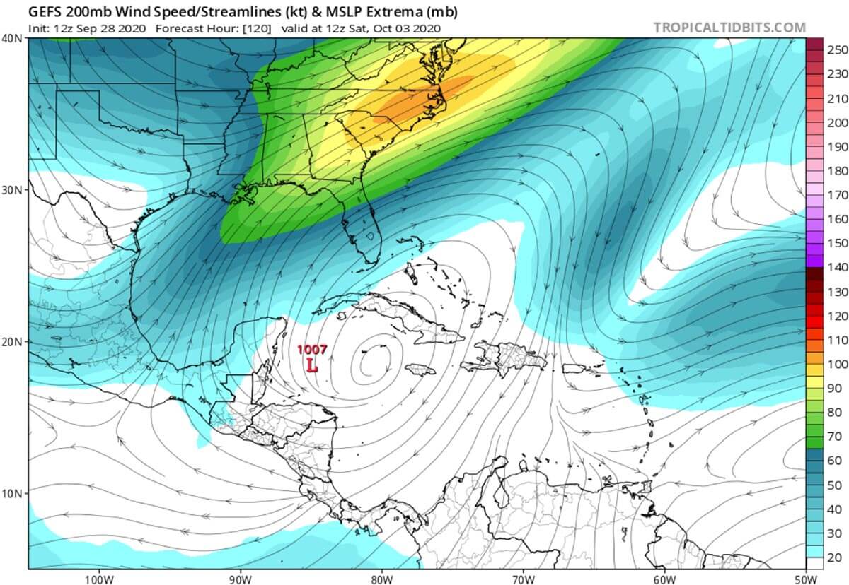 This means the upper-level divergence over the southern Gulf of Mexico and the northwestern Caribbean Sea. Such a pattern typically favors the formation of convective clouds in the region. The video animation below indicates the potential formation in the northwestern Caribbean late this week.