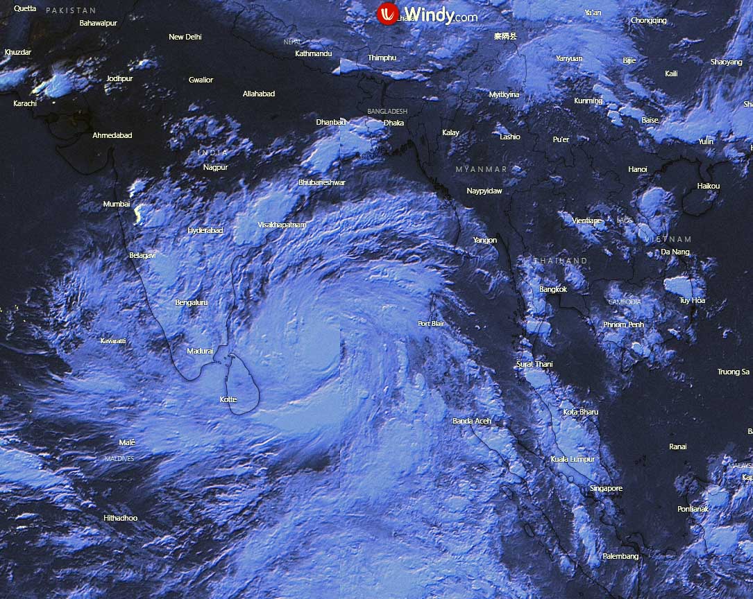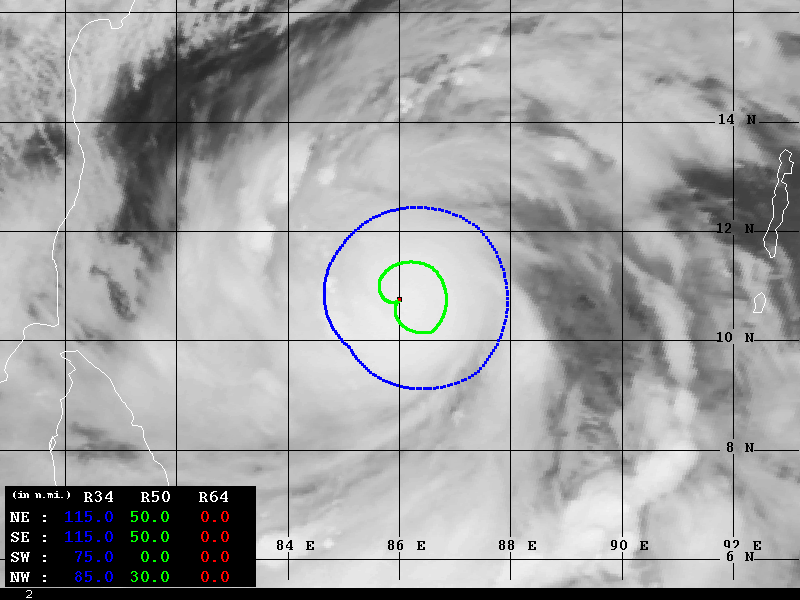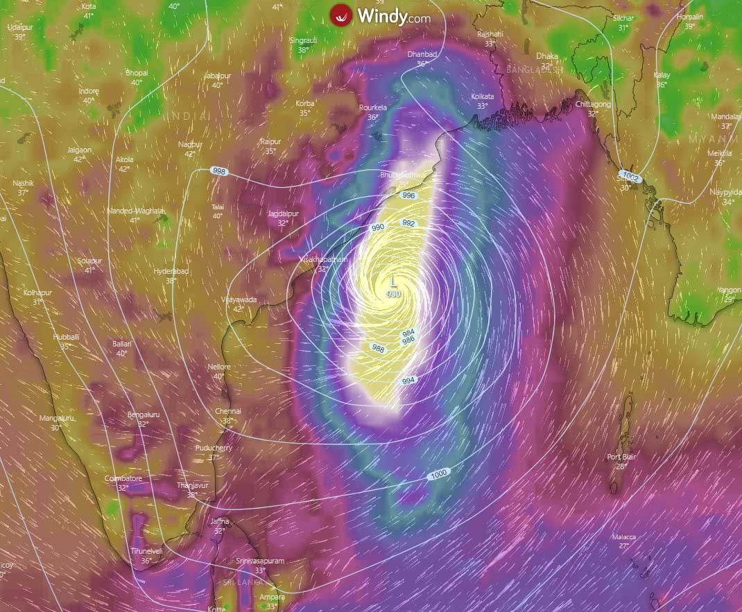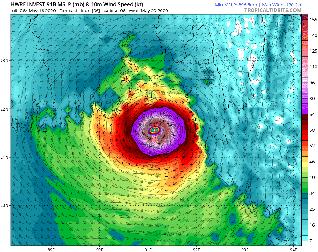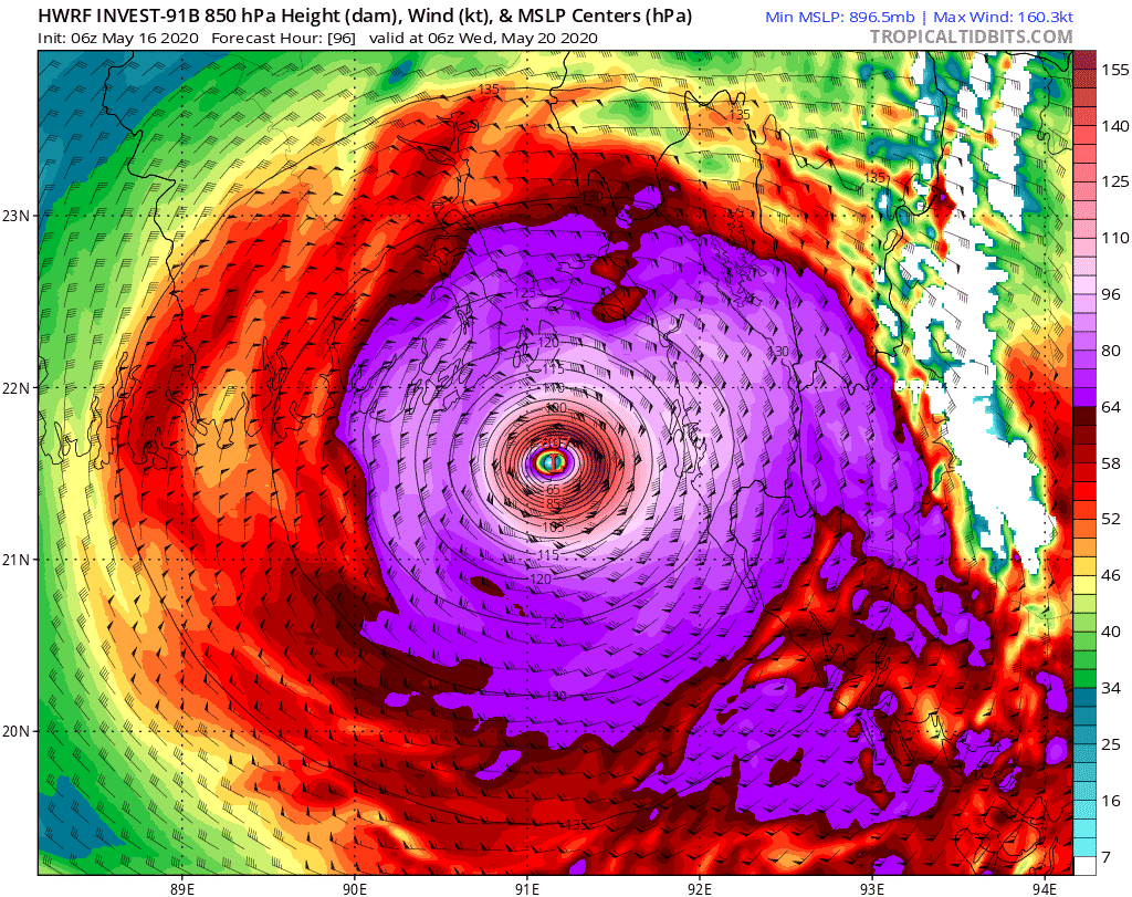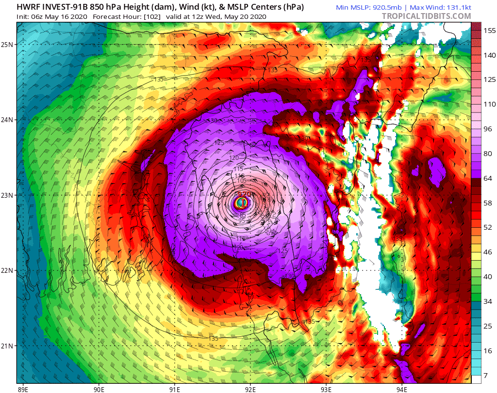 Here is 850 mbar and 10 m sustained winds for the local Wednesday evening in Bangladesh and India. The system could become a violent one with more than 120 knot winds. That would be at least a Category 4!