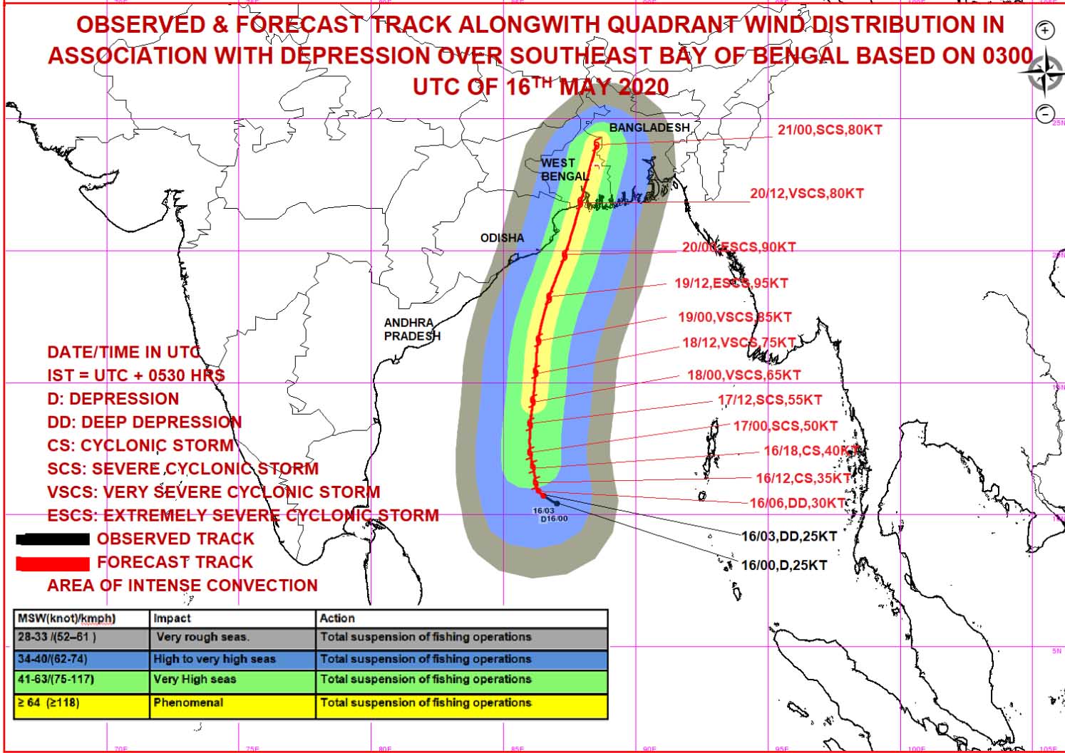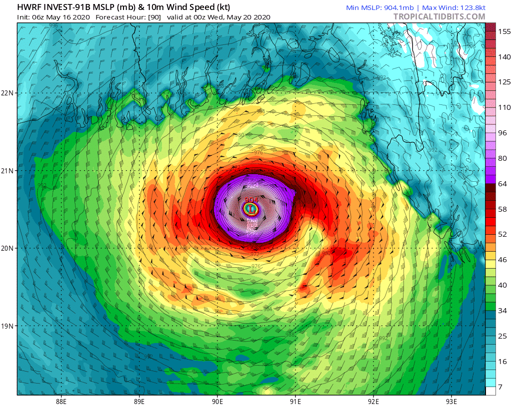 Huge wind swath is likely to be expected with this system, as is it very large. Also, deep convection and very warm SSTs should bring tons of rain. And become extremely dangerous over the flatlands of Bangladesh and northeast India. This tropical system could, based on HWRF model, bring 400-550 mm of rainfall along its track. Depend on the track of the low, the potential landfall is not yet defined so far in advance. But it should happen by mid this week: