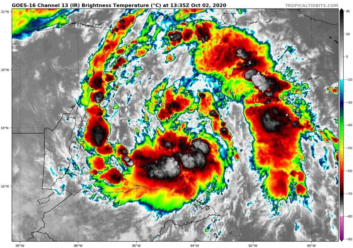 The infrared satellite imagery indicates that convective bands include explosive storms with clouds top temperature near -80 °C.