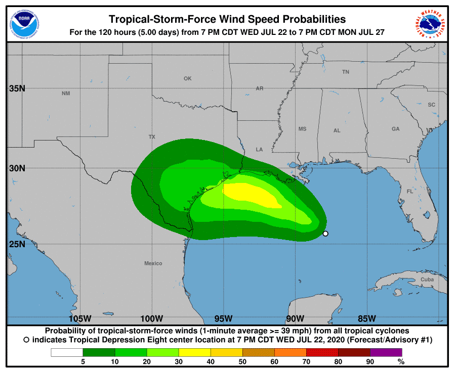 The National Hurricane Center (NHC) is forecasting Hanna to become a Tropical Storm tomorrow morning, Friday, July 24th. Above the normal Gulf of Mexico, waters are feeding the storms and therefore support further strengthening of the depression. Hanna should maintain its Tropical Storm strength until landfall in southern Texas on Saturday morning.