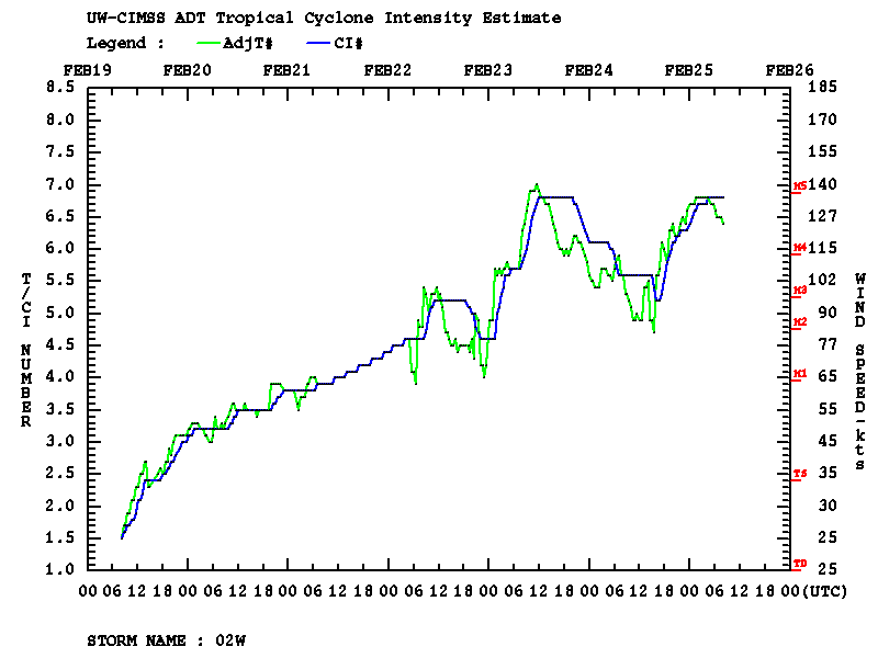 Advanced Dvorak Techique chart indicated Wutip’s maximum strength was likely reached this weekend with around 140-145 knots sustained winds at peak strength.